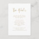 Diese modernen, einfachen und eleganten Gästekarten sind mit einem minimalistischen Goldtext-Design aus Imitat und einem stilvollen, handgeschriebenen Drehbuch auf weißem Hintergrund ausgestattet. Sie können diese Karten für die Anfahrt, Empfang- oder Transportinformationen, Hotel- oder Unterkunftsinformationen und alle anderen Hochzeitsdetails verwenden, die Sie für Ihre Gäste benötigen.