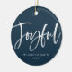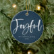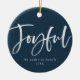 Festliche Weihnachtsschmuck mit dem Wort "Joyful" in einem weißen, handgeschriebenen Script-Schriftart vor einem marinen Hintergrund mit Ihrem Namen und dem Jahr unten. Fügen Sie Ihr Lieblings-Foto oder Ihr Familienname auf die Rückseite!