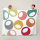 Diese große Fleecedecke hat ein modernes Design in der Mitte des Jahrhunderts mit Kreisen in Retrotönen in Blau, lila, Rosa, Braun, Limon und Gold mit weißen Ovalen.