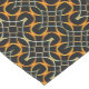 Ein schönes, kompliziertes, geometrisches Design und ein orange und grau blaues keltisches Knoten über einem schwarzen Hintergrund, mit einer modernen, metallischen Struktur.
