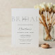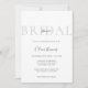 Diese Brautdusche lädt zu einem eleganten und raffinierten Design mit einem weichen, eleganten Ambiente ein. Der Hintergrund ist weiß und das Wort "BRIDAL" wird in großen, hellgrauen Großbuchstaben oben angezeigt, was einen subtilen und dennoch stilvollen Hintergrund schafft. Das Wort "Dusche" überlagert sich in einem kleinen, zarten Skript-Schriftart. Der folgende Text ist zentriert, mit einer Mischung aus Großserifenschrift und kursiven Schriftart, die dem Namen und den Veranstaltungsdetails der Braut eine anmutige Touch hinzufügen. Die Einrichtung ist einfach, luftig und raffiniert und vermittelt eine moderne, elegante Ästhetik, die perfekt für eine Brautfeier geeignet ist.