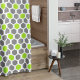 Dieser Duschvorhang weist ein buntes geometrisches Hexagon-Muster in Kalkgrün und Grau auf.