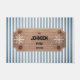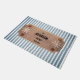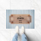 Modernes Marine Design Striped Doormat Diese benutzerdefinierte Türmatte verfügt über Muscheln und Bootsräder umgeben vier Zeilen benutzerdefinierten Text in eleganten schwarzen Buchstaben auf einem gestreiften blau-weiß gestreiften Muster. Passen Sie Ihre Daten an oder machen Sie es zu einem Geschenk, an das Sie sich erinnern können.