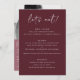 Merlot / Burgund / Wine Wedding Menu: Dieses moderne Hochzeitsmenü verfügt über handgeschriebenen Text auf einem Merlot Hintergrund auf der Vorderseite mit dem Foto des Paares und danke Ihnen Nachricht auf der Rückseite. Es ist das perfekte zweiseitige Hochzeitsmenü, das sowohl als Menü als auch als Geschenk dient.
