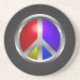 Moderner Sleek Metallic Peace Sign Untersetzer. Farbenfrohe, moderne Rot-, Blau-, Gelb- und lila-metallische Friedensstiftung auf schwarzem metallischem Hintergrund. Das moderne Friedenszeichen wurde 1958 von Gerald Holtom für die Britische Kampagne für Nukleare Abrüstung entworfen. Die vertikale Linie in der Mitte repräsentiert das Flaggensemaphorsignal für den Buchstaben D, und die Abwärtslinien auf beiden Seiten stellen das Semaphorsignal für den Buchstaben N.Supreme Customs Art & Design Studio dar.