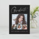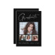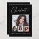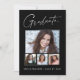 Moderne, moderne, einfache und elegante "4-Foto"-Abschluss-Ansichtskarten mit Designelementen moderner Texte mit einem einzigartigen Kalligraphie-Tintenskript. Die Fotos des Absolventen werden mit einem feinen und minimalistischen Gradientenband betont. Auf der Kartenrückseite finden Sie personalisierte Textstellen für Informationen über Ihren Abschluss. Schwarz & Weiß oder einfach den Hintergrund anpassen, um der Grundfarbe Ihrer Schule oder einer beliebigen Farbe Ihrer Wahl zu entsprechen. Perfekt für die Gymnasialstufe, die Uni und den Hochschulstudiengang.