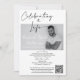 Diese Beerdigung Memorial Service Invitation ist ein eleganter moderner minimalistischer Stil, der eine elegante handgeschriebene Schrift enthält, die "das Leben feiern", gepaart mit einem schwarzen Serif-Text, den Sie personalisieren den Namen Ihrer verstorbenen Lieben und ihr Geburtsdatum und ihr Todesdatum. Es ist einfach, das Foto und den QR-Code zu personalisieren, um die wertvollen Erinnerungen zu teilen oder Anweisungen zum Grab oder Grab geben Ort. Bitte beachten Sie: Die handgeschriebene Schriftzeichen "Feiern des Lebens", "Dienstzeiten", "gefolgt von Empfang" und andere grafische Kunstwerke und Elemente können nicht bearbeitet, verändert, verschoben oder gelöscht werden. Sie sind repariert. Sie können diese Gedenkeinladung nach Ihren Wünschen anpassen.