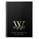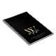 Personalisiertes, einfaches und elegantes, modernes schwarzes Notizbuch mit einem Monogramm-Erstling in einem hellen Goldton und einem weißen Namen. Fügen Sie unten eine oder zwei Textzeilen hinzu oder verließ Sie leer.