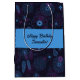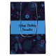 Ein subtiler Kunstblumendruck in einer eleganten Geschenktasche. Verwenden Sie "Personalisieren Sie diese Vorlage", um den Text und den Namen von "Happy Birthday Samantha!" zu ändern; Textänderungen werden auf beiden Seiten reflektiert. Mit modernen geometrischen Varianten von Blume wie japanische Anemonen, Daffodien, Veilchen, Stiefmütterchen, Gänseblümchen, Rose, Michaelmas Daisies, Cinquefoils, Primaten, Buddleia, Clematis, Gardenia, Phlox und vergessene Noten. Der Druck ist hellblau und zeigt lila Linien auf dunkelblauem Hintergrund.