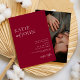 Laden Sie Ihre Freunde und Liebsten zu einer gemütlichen Hochzeit ein. Die schicke Einladung mit einem einfachen Serif-Schriftart Ihrer Namen und Hochzeitsdetails und einem Kalligraphiezeichen in einem leuchtend roten Bordeaux-Hintergrund, zusammen mit Ihrem hübschen Foto im Hintergrund, das Sie persönlich gestalten können.