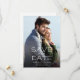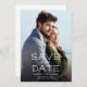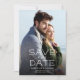 Diese Ankündigung Datum freihalten verfügt über ein vertikales Foto, das die Vorderseite der Karte ausfüllt. Der Text wird oben auf dem Foto in Weiß angezeigt. Die Rückseite bietet einen eigenen Text für weitere Details zur Hochzeit.