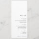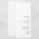Dieses moderne und schlichte, minimalistisch-schwarz-weiße Hochzeitsmenü ist für eine leicht elegante Tischumgebung konzipiert. Jede Karte verfügt über ein übersichtliches und übersichtliches Layout - ideal, um jeden Gast mit einem Single zu belegen. Der Text ist sorgfältig auf den unteren Rand ausgerichtet und verlasst oben offenen Platz zum Hinzufügen von Namensmarken, Wachs-Siegeln oder dekorativen Akzenten. Einfach und dennoch raffiniert, ergänzt dieses Design jeden Hochzeitsstil mit ausgewogener Typografie und zeitloser Eleganz.