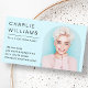 Hellblaue Aqua oder beliebige farbige Visitenkarten, die Ihr Foto in einem bogenförmigen Rahmen darstellen. Modernes, minimalistisches Design.