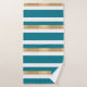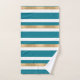 Modernes aquamarines, weißes und goldfarbenes Handtuchhandtuchhandtuch-Set mit waagerecht gestreiftem Muster. Eine aquamarine und goldene Tontafel dekorative Plakette, hat eine maßgeschneiderte weiße ein Buchstaben Monogramm. Personalisieren Sie den Brief, um Ihre Bedürfnisse zu Anzug. Eine passende Badezimmerdekoration ist vorhanden.