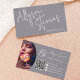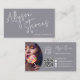 Eine moderne und fett-schminkende Makeup-Künstlerin und Friseur-Visitenkarte mit überdimensionalem Namen an der Vorderseite in handgeschriebenem Stil, Schriftart und Foto, QR-Code und Social Media an der Rückseite in staubblauer Farbe. Alle Farben sind bearbeitbar.