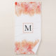 Modernes Korallenriff Wasserfarbe nautische Monogramm Bath Handtuch Set. Das Badetuch weist einen Rand von weißem Korallenriff auf lebendigen Korallenwasser-Splash und Ihr Monogramm in einem Rahmen mit Kontur in der Mitte. Das Handtuch zeigt ein Muster des gleichen Korallenriffs, und das Waschlappen ist mit einem Korallenwasser bedeckt.