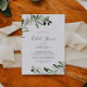 Diese moderne Oliven-Ast Braudusche lädt zu einem boho Polterabend ein. Das rustikale und dennoch elegante Design besticht durch einfache botanisch-grüne Blätter und schwarze Oliven auf einem kleinen Ast mit klassischem mediterranem Ambiente.