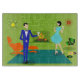 Dieses moderne Schneiderboard aus dem Mittelalter sieht aus wie eine Szene aus einer romantischen Komödie. Das minimalistische Design der 60er Jahre besticht durch ein ansprechendes Cartoon-Paar, das einen romantischen Abend bei Zuhause genießt. Das elegante Zimmer besticht durch eine grüne Steinmauer und einen Kamin. Die Einrichtung der Zimmer umfasst einen orangefarbenen, mit einem Stuhl passenden Sitzbereich, eine rote Wanduhr, eine gelbe Sternexplosion, eine Lampe mit Sputnik und einen orangefarbenen Beistelltisch, der zu einem tragbaren, grünen Schallplattenspieler Zuhause. Auf dem Fußboden neben dem Endtisch sieht man eine Schallplatte aus einem kitschigen Albumcover. In der Mitte des grünen Fußbodens befindet sich ein großer, rechteckiger, aquamariner Teppich. Mitten in der Szene haben wir ein sehr raffiniertes Paar. Es gibt einen suave Mann in einem königsblauen Anzug, weißes Shirt und blaue Bogen Krawatte. Der große, dunkle und gut aussehende Mann blickt auf seinen hübschen Begleiter. Die elegante, ravenhaarige Frau trägt ein üppiges Aqua-Kleid. Sie besitzen jeweils ein Kristallmartini-Glas mit schwimmendem Olivenöl. Prost! Hier zum perfekten Abend bei Zuhause!