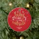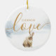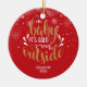 Personalisierte Weihnachtsschmuck mit der Phrase "Baby, es ist kalt draußen", Set in einem eleganten, goldfarbenen und weißen Schriftzeichen auf rotem Hintergrund mit fallenden Schneeflocken. Auf der Rückseite befindet sich ein Hase auf einer winterlichen Waldlandschaft mit dem Wort Liebe Set in einem schönen Schriftart mit Goldschrift. Sie können sich mit dem Namen und dem Jahr eines geliebten Menschen personalisieren. Ein perfektes Geschenk als Weihnachtsdekoration! Entwickelt von Thisisnotme©