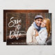 Modern Brush Script Save the Date Verlobung Announcement Foto Card - Weiße Schrift, rustikale Holzabdeckung