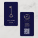 Moderne Realtor Real Anwesen Agent Midnight Blue Business Card. Mit dieser eleganten Visitenkarte, die ein Vintages goldenes Schlüsseldesign und einen QR-Code enthält, der direkt auf Ihre Website oder Immobilien verweist, können Sie sich im überfüllten realen Anwesen-Markt austoben. Als Immobilien-Agent-Berater wissen Sie, dass der Schlüssel zum Erfolg darin besteht, bei potenziellen Kunden einen bleibenden Eindruck zu machen. Diese Visitenkarte macht genau das, indem sie ein Gefühl von Kompetenz und Raffinesse vermittelt, das Sie von der Konkurrenz abhebt.