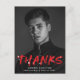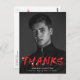Stilvolle, moderne Abschluss danke Ihnen Postcard mit dem senkrechten Foto des Absolventen mit "Dank" in roter Schrift mit weißen Spritzern. Personalisieren Sie die Vorderseite des Dankes Postcard, indem Sie den Namen des Absolventen, den Schulnamen und das Abschluss Jahr. Auf der Rückseite des Abschlusses danke Ihnen postcard verfügt über Ihre Rücksendeadresse und Platz für eine getippte oder handgeschriebene Dankeschön-Nachricht.