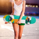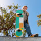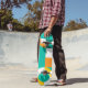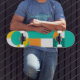 Modern farbiges geometrisches Musterskateboard. Von der Seite her gesehen, ist es interessant, dass Sie sich für mich interessieren. Ich freue mich, Ihnen zu helfen! filtriert