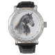 Ein modernes Uhrwerk mit Aquarellmalerei auf einem schwarzen Pferd und einem einfachen Uhrengesicht macht ein schönes Reitgeschenk und ein Pferdezubehör für Pferdefreunde und Reiter.