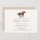 Modernes Pferderennen Derby Party Einladung mit einer Darstellung eines Rennpferdes mit Jockey und gestreiftem Muster auf der Rückseite. Alle Textelemente können so geändert werden, dass sie auch für andere Veranstaltungen genutzt werden können: klassische Reitferien-Einladung, Pferdegeburtstag-Party, Derby-Party, Stallöffnung und vieles mehr. Hintergrund, Farbe der Illustration und Textfarben können mit dem Designwerkzeug geändert werden!
