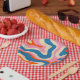 Moderne Retro Liquid Swirl farbenfrohe Abstrakte Muster Square rosa Blau Rot Orange Beige. Zeitgenössischer Pop 60er 90s Y2K boho ästhetisch; ein wenig trippig und psychedelisch. Von Kierkegaard Design Studio.