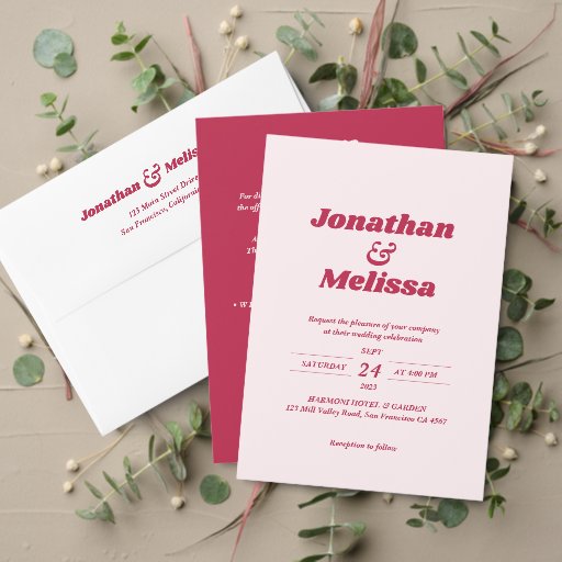 Eine moderne, einzigartige Retro-Hochzeitseinladung, die ein stilvolles, elegantes Typografie-Skript mit der trendigen Farbe viva magenta enthält und einen QR-Code für die Hochzeitswebsite sowie alle Details und Anleitungen enthält, die Ihr Gast benötigt, um online uAwg zu machen und Ihre Hochzeitswebsite für alle Details zu sehen.