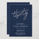 Eine schlichte, moderne, elegante und schicke Party Einladung zum 30. Geburtstag mit marineblau strukturiertem Hintergrund (das ist ein digitaler Effekt, keine reale Textur), das in Rhinestonen (simuliert, nicht echte Steine) überlagerte Dreifach, moderne Kalligraphie-Schrift und Typografie in modernen Schriftart. Ein elegantes, modernes Design für eine Frau an ihrem dreißigsten Geburtstag, für ein elegantes Geburtstagsoiree oder ein Party zum Abendessen oder eine andere elegante Angelegenheit.