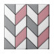 Diese moderne Keramik-Kachel weist ein geometrisches Herringbone-Muster in Weiß, Rosa und Grau mit schwarzen Linien auf. Die Farben und die Mustergröße sind anpassbar.