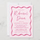 Einladend zu Ihrem Probe Dinner im Stil mit unseren modernen Pink Wavy Rahmen Hochzeitsessen Probe Einladungen. Das Design enthält die Worte "Probe Dinner", die in einem handgeschriebenen rosa Skript im Kontrast zu einem hellrosa Hintergrund angezeigt werden. Ihre Probe-Dinner-Details sind von einem rosa gewellten Rahmen umgeben. Dieses Retro-Probe-Dinner lädt zu lässigen und modernen Proben ein.