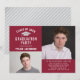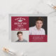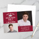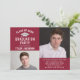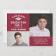 Mit dieser modernen und eleganten Abschlussfeiereinladung mit Silbergrad-Cap-Image kündigen Sie Ihren Absolvent stilvoll an. Das Design weist einen dunkelmaroonroten Hintergrund mit zwei Räumen für Senioren-Fotos auf, silbergraue und weiße Formulierungen, die mit den Informationen und Party des Absolventen personalisiert werden können, und ein einfaches Muster von weißen diagonalen Streifen auf der Kartenrückseite. Text- und Hintergrundfarben können angepasst werden.