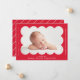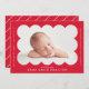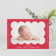 Einfache und moderne Geburtsankündigung mit dem Foto Ihres Babys, das in einem hellen, roten Skallopierrahmen eingebettet ist. Personalisieren Sie die rote Geburtsankündigung, indem Sie den Namen Ihres Babys und zusätzliche Informationen in weißer Schrift hinzufügen. Die Rückseite der Karte weist ein minimales, rot-weißes Streifen-Design auf.