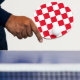 Dieses Tischtennispaddel zeichnet sich durch ein trendiges geometrisches Muster aus, ein berühmtes kroatisches Schachbrett in Rot und Weiß.