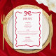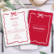 Dieses schlichte, moderne und leicht stilvolle Quinceañera-Menü besticht durch fett rote Typografie, einen schlichten, weißen Hintergrund und einen handgezeichnet Bogen und Rahmen für einen trendigen Coquette-Look. Es ist perfekt für einen Ehrengast, der Einfachheit schätzt. Ob für ein elegantes Abendessen oder ein lustiges Party - dieses minimalistische Design lässt sich leicht mit Ihrem Namen, Datum und Veranstaltungsdetails personalisieren. Ein eleganter Weg, um Freunde und Familie zu einem Geburtstag einzuladen.