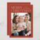 Moderne Weihnachtskarte mit "Fröhlicher Weihnachten", die oben im Design in trendiger weißer Schrift mit Rosthintergrund ausgestellt ist. Personalisieren Sie die einfache Weihnachtskarte mit Ihrem Familiennamen und Foto. Die Karte kehrt um, um einen Rosthintergrund mit subtilen weißen Punkten (Schnee) anzuzeigen.