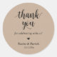 Moderne Hochzeit rustikale Danksagung Geschenke Classic Gefallen Round Sticker, in sauberer Schrift, wenig niedliches rotes Herz, mit Braut und Bräutigam Signatur und Hochzeitstag, Hütte braunes Kraftthema.