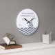 This contemporary relief clock is done entirely in a grey and white color scheme. The water is a grey and white chevron zigzag pattern and the relief boat has a modern line art pattern in the sails. There are three seagulls flying overhead. Typography reads Welcome aboard the YOUR BOAT NAME, which you personalize with the persalize this template button on the right. The first line ist is customizable so ycan change it to whatever you like, i.e., "Welcome aboard Jack's relief boat", "Time to go sailing with Jack and Michelle" usw.
