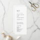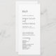 Dieses elegante, schwarz-weiße Hochzeitsprogramm ist perfekt für eine einfache Hochzeit. Das minimalistische Boho Design zeichnet sich durch rustikale, einzigartige und stilvolle böhmische Typografie in minimalem sauberen Schwarz-Weiß. Geben Sie den Namen der Braut und des Bräutigams, das Datum und den Ort der Hochzeit, Dankeschön-Nachricht, Dienstordnung, Brautparty und ein optionales "in Loving Memorial" ein.
