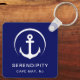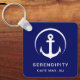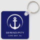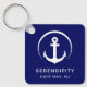 Ein moderner nautischer Schlüsselanhänger für Ihr Boot, der eine weiße Abbildung eines Ankerkreises auf marinebasischem Hintergrund zeigt. Personalisieren Sie mit dem Namen und der Lage Ihres Bootes in einfacher weißer Typografie.