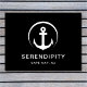 Eine moderne nautische Tür für Ihr Boot, die eine weiße Abbildung eines Ankeres in einem Kreis auf schwarzem Hintergrund zeigt. Personalisieren Sie mit dem Namen und der Lage Ihres Bootes in einfacher weißer Typografie.