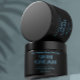 Ein modernes schwarzes Kosmetikklebeetikett mit blau-grauem Text mit Platz für Ihren Firmennamen, Social Media Handle, Website, Postanschrift und Telefonnummer.