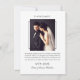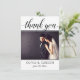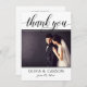 Moderne und schicke, schwarz-weiße Hochzeitsflache Noten mit einem Foto von Braut und Bräutigam vorne und hinten mit einem stilvollen, schwarzen typografischen Design, mit fett kalligraphischen Schriftzeichen Akzenten und elegantem, individuellem Text, der mit einer besonderen Danksagung personalisiert werden kann.