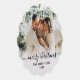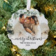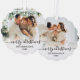Modernes Niedliches Minimalistisches Script 2 Foto Frohe Weihnachtskrippe Weihnachtszittel Ornament Card. Dieses festliche, schlichte, minimalistische, skurrile Grußkarten-Template aus zwei Fotos enthält Familienname, Year und einen "Frohen Weihnachten" Grußtext, der in einem handgeschriebenen Wirblen Sash-Schwanz-Schriftart-Kalligraphie-Foto-Overlay in Schwarz auf weißem Farbverlauf geschrieben wird. Hübsche Grußkarte für Ihre Familie und Freunde in der Weihnachtszeit.