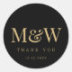 Moderne Black Gold Monogram Wedding Danke klassische Round Sticker. Wunderschönes schwarz-goldenes Design mit moderner Typografie und Paarinitialen, danke, und Datum. Herrlicher goldfarbener Text auf schwarz. Personalisieren Sie mit den Namen der Braut und des Bräutigams, dem Hochzeitstag, können Sie den Beispieltext und/oder die Farben nach Ihren Wünschen anpassen. Hervorragend zum Anpassen von Gefälligkeiten, oder für Siegel auf Dankeschön. Wir laden Sie ein, unseren Shop, Austen & Grace, zu besuchen, um die komplette Hochzeitssuite, passende Produkte und mehr zu sehen. Bitte kontaktieren Sie uns, wenn Sie Hilfe benötigen.