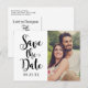 Moderne Hochzeitskarten Save the Date Foto bieten ein modernes Schwarz-Weiß-Schema mit fett gedruckter und spielerischer handgeschriebener Kalligraphie-Schrift-Typografie mit stilvollen Bildlaufdetails. Personalisieren Sie den lässigen und dennoch eleganten, individuellen Text auf der Vorder- und Rückseite der Postkarte mit Ihren Tagdetails und fügen Sie ein Lieblingsbild der Verlobung hinzu.