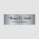 Modernes berufliches Namensschild mit Ihrem Namen in einem stilvollen Drehbuch und Titel in einfacher Typografie auf einem silbernen Imitat gebürstet Metall Hintergrund.